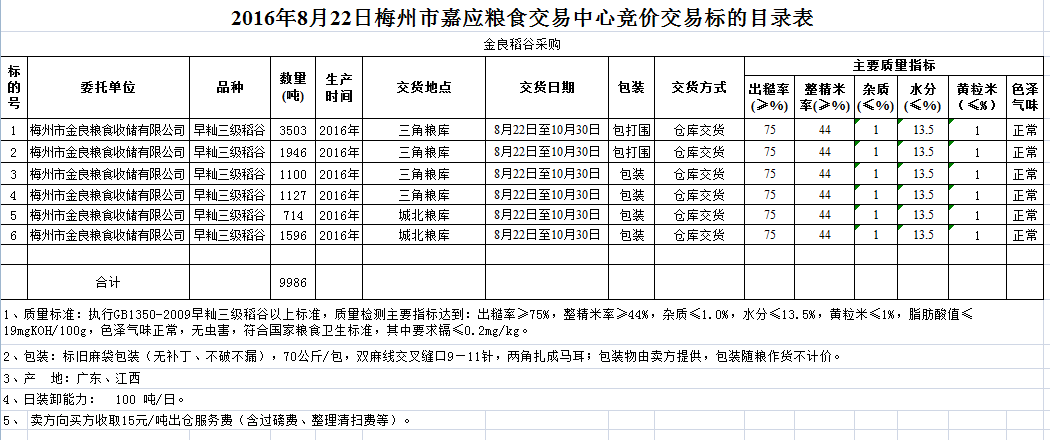 受客戶委托,梅州市嘉應(yīng)糧食交易中心有限公司定于2016年8月22日舉辦糧食競(jìng)價(jià)交易會(huì),梅州市金良糧食收儲(chǔ)有限公司擬采購(gòu)2016年產(chǎn)早秈三級(jí)稻谷9986噸。