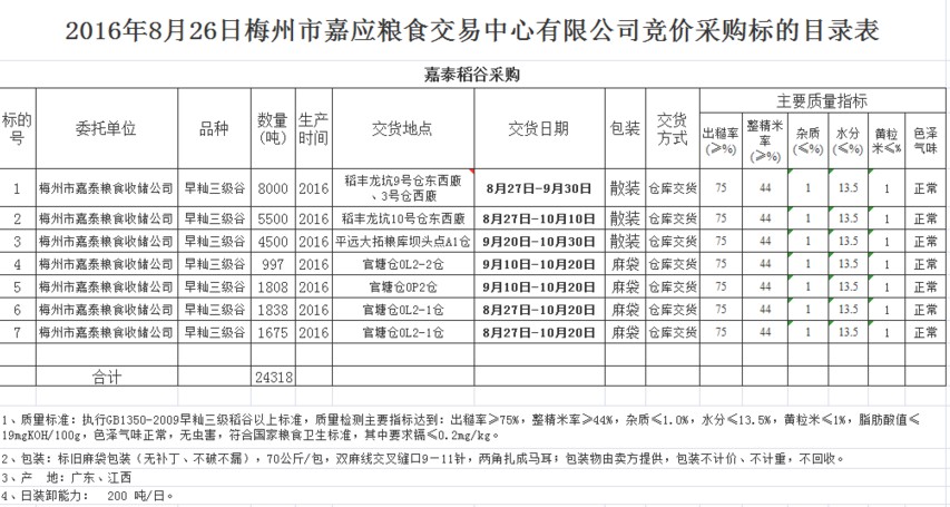 受客戶委托,梅州市嘉泰糧食收儲(chǔ)公司擬采購2016年產(chǎn)早秈三級(jí)稻谷24318噸。
