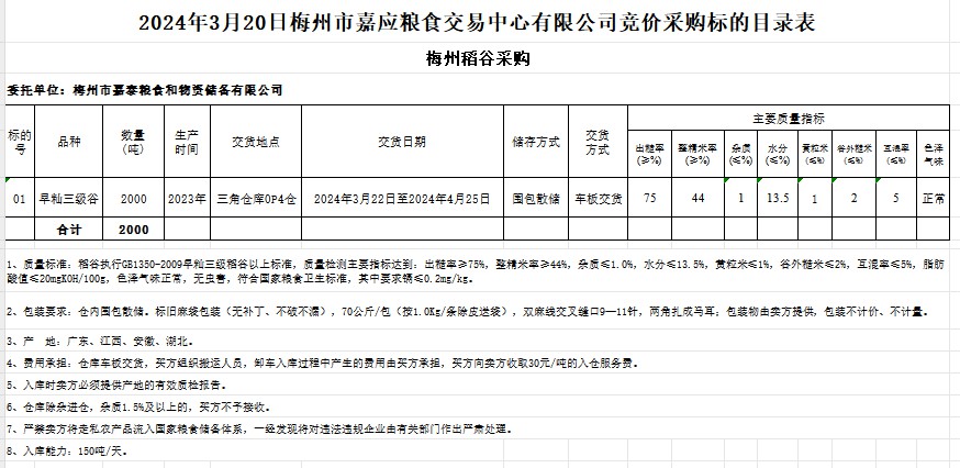 2024年3月20日梅州市嘉泰糧食和物資儲(chǔ)備有限公司稻谷采購