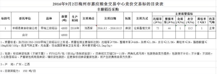 受客戶委托,豐順縣糧食收儲公司擬采購2016年產(chǎn)早秈三級稻谷4800噸。