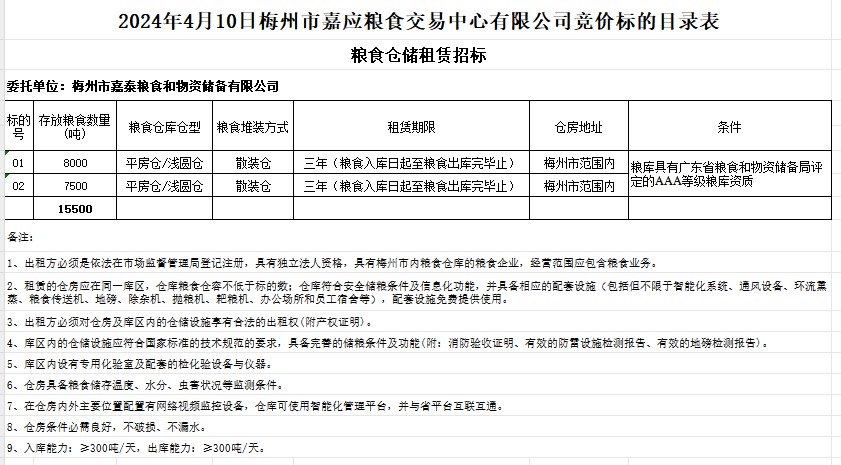 1.出租方必須是依法在市場(chǎng)監(jiān)督管理局登記注冊(cè),具有獨(dú)立法人資格,具有梅州市內(nèi)糧食倉庫的糧食企業(yè),經(jīng)營范圍應(yīng)包含糧食業(yè)務(wù);