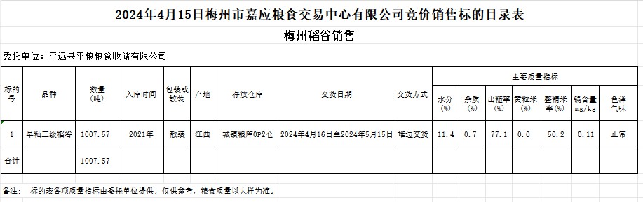 受客戶委托,梅州市嘉應(yīng)糧食交易中心有限公司定于2024年4月15日(星期一)舉辦糧食競(jìng)價(jià)交易會(huì)。平遠(yuǎn)縣平糧糧食收儲(chǔ)有限公司擬銷(xiāo)售2021年產(chǎn)早秈稻1007.57噸。
