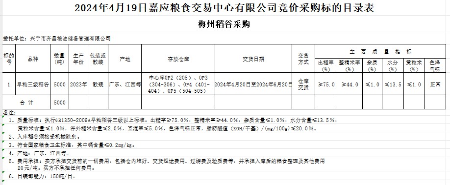 受客戶委托,梅州市嘉應糧食交易中心有限公司定于2024年4月19日(星期五)舉辦糧食競價交易會。興寧市齊昌糧油儲備管理有限公司擬采購2023年產(chǎn)早秈稻5000噸。