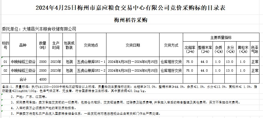受客戶委托,梅州市嘉應(yīng)糧食交易中心有限公司定于2024年4月25日(星期四)舉辦糧食競價交易會。大埔縣興豐糧食收儲有限公司擬采購2023年產(chǎn)中晚秈稻谷4000噸。