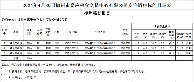 受客戶委托,梅州市嘉應(yīng)糧食交易中心有限公司定于2024年4月30日(星期二)舉辦糧食競價(jià)交易會(huì)。梅州市嘉泰糧食和物資儲(chǔ)備有限公司擬銷售2021年早秈稻5600噸。