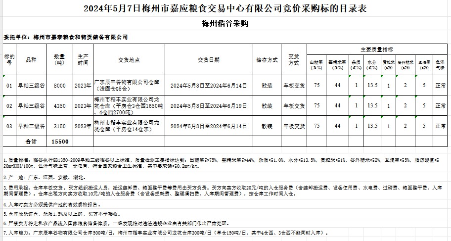 受客戶委托,梅州市嘉應(yīng)糧食交易中心有限公司定于2024年5月7日(星期二)舉辦糧食競價交易會。梅州市嘉泰糧食和物資儲備有限公司擬采購2023年產(chǎn)早秈稻15500噸。