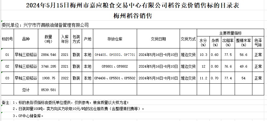 受客戶委托,梅州市嘉應(yīng)糧食交易中心有限公司定于2024年5月15日(星期三)舉辦糧食競(jìng)價(jià)交易會(huì)。興寧市齊昌糧油儲(chǔ)備管理有限公司擬銷售2021年、2022年產(chǎn)早秈稻8539.581噸。