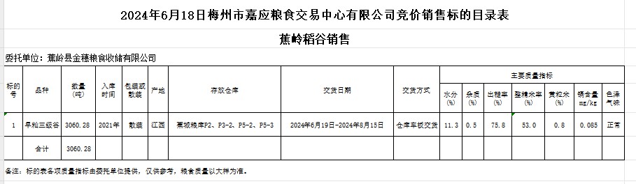 受客戶委托,梅州市嘉應(yīng)糧食交易中心有限公司定于2024年6月18日(星期二)舉辦糧食競(jìng)價(jià)交易會(huì)。蕉嶺縣金穗糧食收儲(chǔ)有限公司擬銷售2021年產(chǎn)早秈稻3060.28噸。