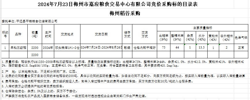 受客戶委托,梅州市嘉應糧食交易中心有限公司定于2024年7月23日(星期二)舉辦糧食競價交易會。平遠縣平糧糧食收儲有限公司擬采購2024年產早秈稻谷2200噸。