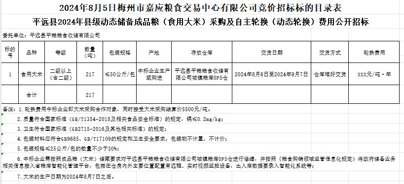受客戶委托,梅州市嘉應(yīng)糧食交易中心有限公司定于2024年8月5日(星期一)上午10時(shí)在廣東省梅州市彬芳大道南161號(hào)梅州市糧食交易中心3樓,舉辦平遠(yuǎn)縣2024年縣級(jí)動(dòng)態(tài)儲(chǔ)備成品糧(食用大米)采購(gòu)及自主輪換(動(dòng)態(tài)輪換)費(fèi)用公開招標(biāo)。