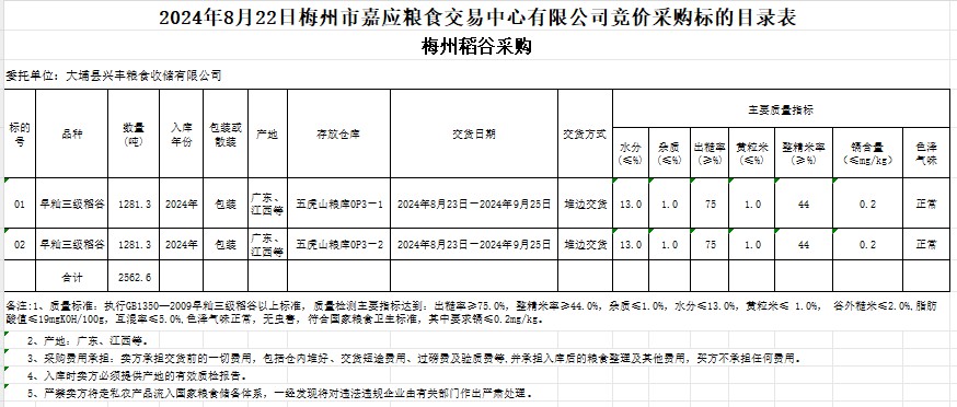 受客戶委托,梅州市嘉應(yīng)糧食交易中心有限公司定于2024年8月22日(星期四)舉辦糧食競(jìng)價(jià)交易會(huì)。大埔縣興豐糧食收儲(chǔ)有限公司擬采購2024年產(chǎn)早秈稻谷2562.6噸。