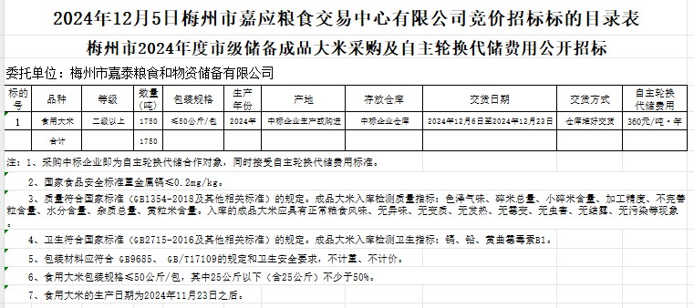 梅州市2024年度市級儲備成品大米采購及自主輪換代儲費(fèi)用公開招標(biāo)公告