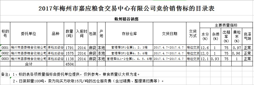 受客戶委托,梅州市嘉應(yīng)糧食交易中心有限公司定于2017年4月7日舉辦糧食競(jìng)價(jià)交易會(huì),梅州市嘉泰糧食收儲(chǔ)公司擬銷售早秈三級(jí)稻谷4504噸。
