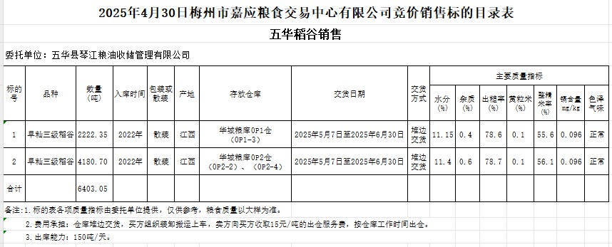 受客戶委托,梅州市嘉應糧食交易中心有限公司定于2025年4月30日(星期三)舉辦糧食競價交易會。五華縣琴江糧油收儲管理有限公司擬銷售2022年產(chǎn)早秈稻谷6403.05噸。