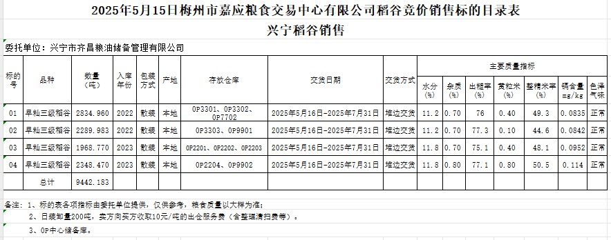 受客戶委托,梅州市嘉應(yīng)糧食交易中心有限公司定于2025年5月15日(星期四)舉辦糧食競價(jià)交易會。興寧市齊昌糧油儲備管理有限公司擬銷售2022年、2023年產(chǎn)早秈稻谷9442.183噸。