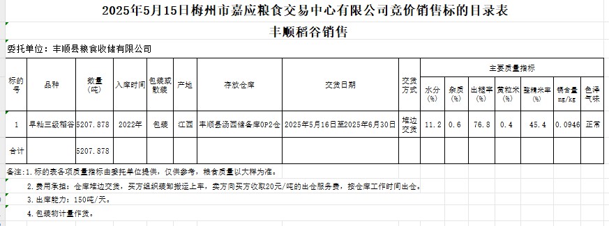 受客戶委托,梅州市嘉應(yīng)糧食交易中心有限公司定于2025年5月15日(星期四)舉辦糧食競(jìng)價(jià)交易會(huì)。豐順縣糧食收儲(chǔ)有限公司擬銷售2022年產(chǎn)早秈稻谷5207.878噸。