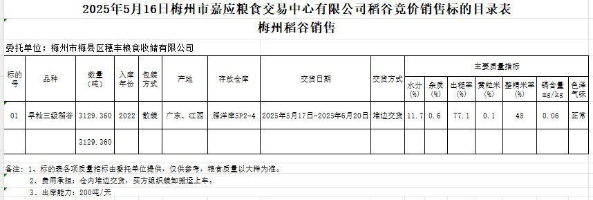 受客戶委托,梅州市嘉應(yīng)糧食交易中心有限公司定于2025年5月16日(星期五)舉辦糧食競價(jià)交易會(huì)。梅州市梅縣區(qū)穗豐糧食收儲(chǔ)有限公司擬銷售2022年產(chǎn)早秈稻谷3129.360噸。
