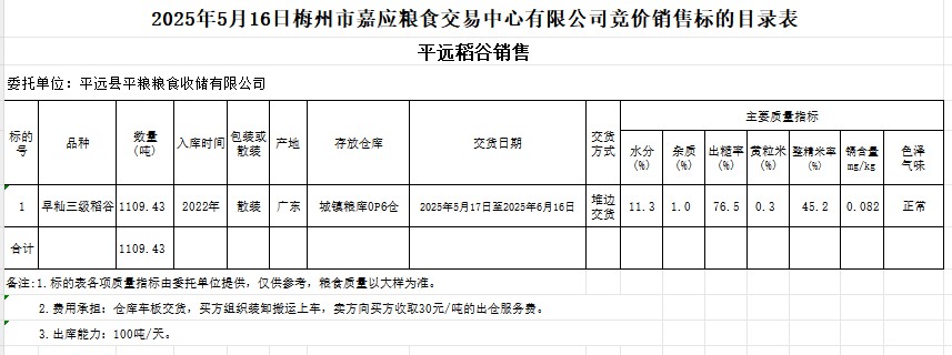 受客戶委托,梅州市嘉應(yīng)糧食交易中心有限公司定于2025年5月16日(星期五)舉辦糧食競價交易會。平遠縣平糧糧食收儲有限公司擬銷售2022年產(chǎn)早秈稻谷1109.43噸。