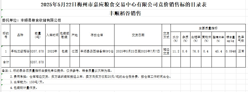 受客戶委托,梅州市嘉應(yīng)糧食交易中心有限公司定于2025年5月22日(星期四)舉辦糧食競價(jià)交易會。豐順縣糧食收儲有限公司擬銷售2022年產(chǎn)早秈稻谷5207.878噸。