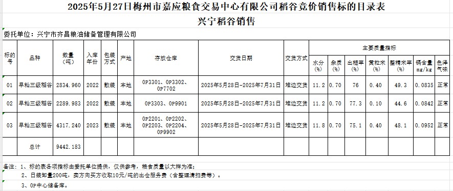 受客戶委托,梅州市嘉應糧食交易中心有限公司定于2025年5月27日(星期二)舉辦糧食競價交易會。興寧市齊昌糧油儲備管理有限公司擬銷售2022年、2023年產(chǎn)早秈稻谷9442.183噸。