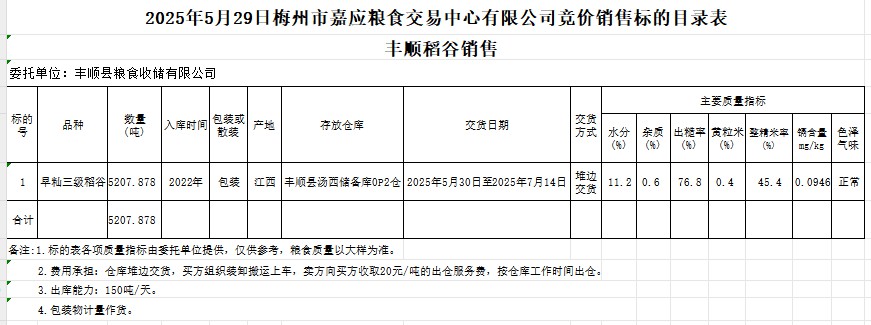 受客戶委托,梅州市嘉應(yīng)糧食交易中心有限公司定于2025年5月29日(星期四)舉辦糧食競價(jià)交易會(huì)。豐順縣糧食收儲(chǔ)有限公司擬銷售2022年產(chǎn)早秈稻谷5207.878噸。