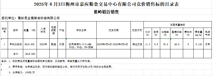受客戶委托,梅州市嘉應糧食交易中心有限公司定于2025年6月3日(星期二)舉辦糧食競價交易會。蕉嶺縣金穗糧食收儲有限公司擬銷售2022年產(chǎn)早秈稻谷3616.930噸。