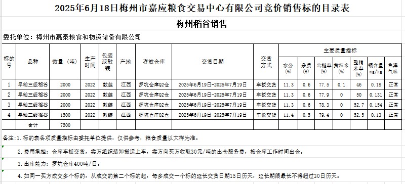 受客戶委托,梅州市嘉應(yīng)糧食交易中心有限公司定于2025年6月18日(星期三)舉辦糧食競價交易會。梅州市嘉泰糧食和物資儲備有限公司擬銷售2022年產(chǎn)早秈稻谷7500噸。