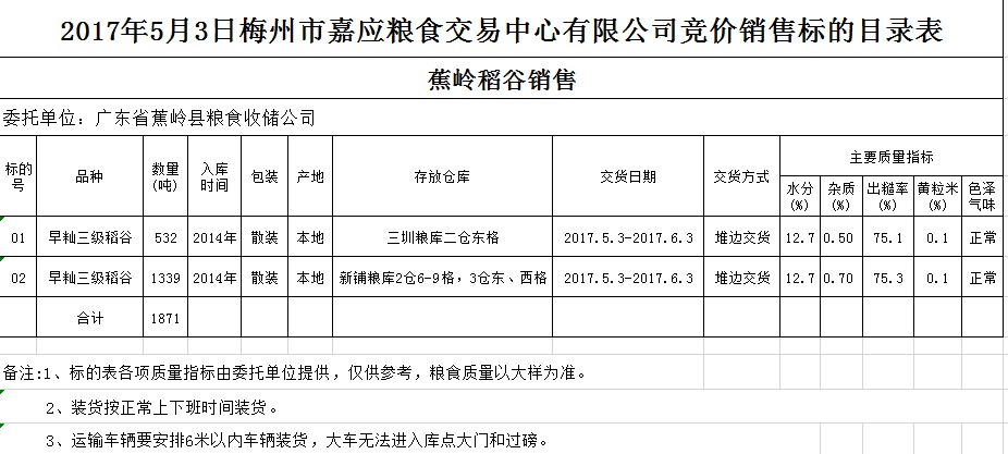 受客戶委托,梅州市嘉應糧食交易中心有限公司定于2017年5月3日舉辦糧食競價交易會,廣東省蕉嶺縣糧食收儲公司擬銷售2014年早秈三級稻谷1871噸。
