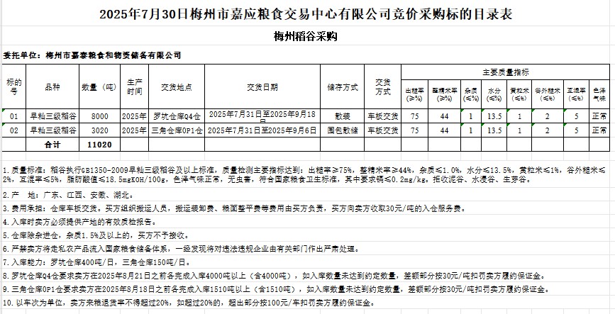 受客戶委托,梅州市嘉應(yīng)糧食交易中心有限公司定于2025年7月30日(星期三)舉辦糧食競價(jià)交易會。梅州市嘉泰糧食和物資儲備有限公司擬采購2025年產(chǎn)早秈稻谷11020噸。