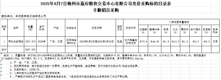 受客戶委托,梅州市嘉應糧食交易中心有限公司定于2025年8月7日(星期四)舉辦糧食競價交易會。豐順縣糧食收儲有限公司擬采購2025年產(chǎn)早秈稻谷5207.878噸。