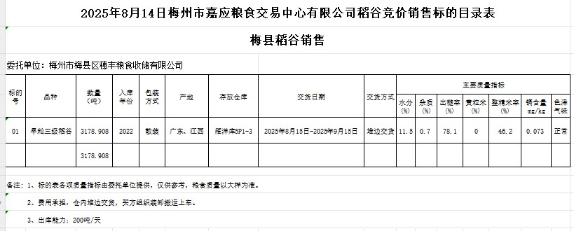 受客戶委托,梅州市嘉應糧食交易中心有限公司定于2025年8月14日(星期四)舉辦糧食競價交易會。梅州市梅縣區(qū)穗豐糧食收儲有限公司擬銷售2022年產(chǎn)早秈稻谷3178.908噸。