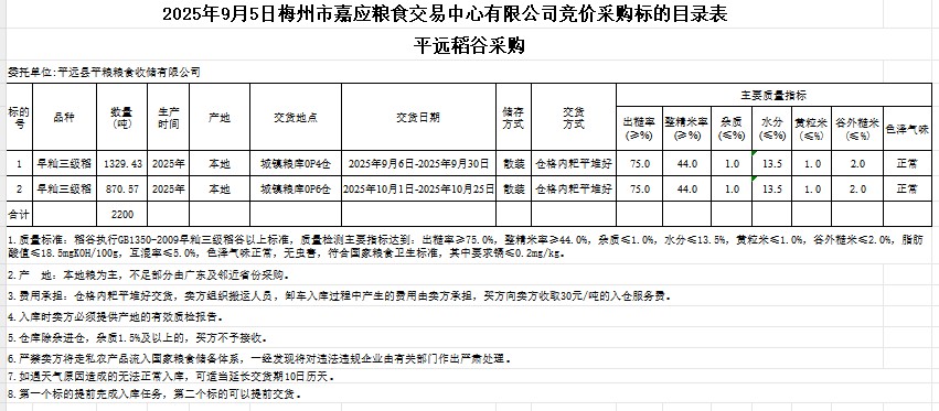 受客戶委托,梅州市嘉應(yīng)糧食交易中心有限公司定于2025年9月5日(星期五)舉辦糧食競價(jià)交易會。平遠(yuǎn)縣平糧糧食收儲有限公司擬采購2025年產(chǎn)早秈稻谷2200噸。