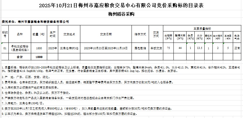 受客戶(hù)委托,梅州市嘉應(yīng)糧食交易中心有限公司定于2025年10月21日(星期二)舉辦糧食競(jìng)價(jià)交易會(huì)。梅州市嘉泰糧食和物資儲(chǔ)備有限公司擬采購(gòu)2025年產(chǎn)早秈稻谷1800噸。