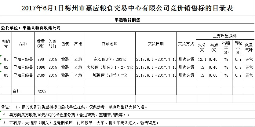 受客戶委托,梅州市嘉應糧食交易中心有限公司定于2017年6月1日舉辦糧食競價交易會,平遠縣糧食收儲公司擬銷售2015年早秈三級稻谷4289噸。