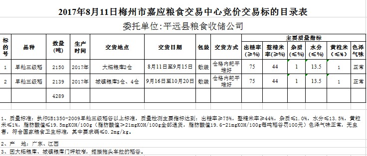 受客戶委托,梅州市嘉應糧食交易中心有限公司定于2017年8月11日舉辦糧食競價交易會,平遠縣糧食收儲公司擬采購2017年早秈三級稻谷共4289噸。