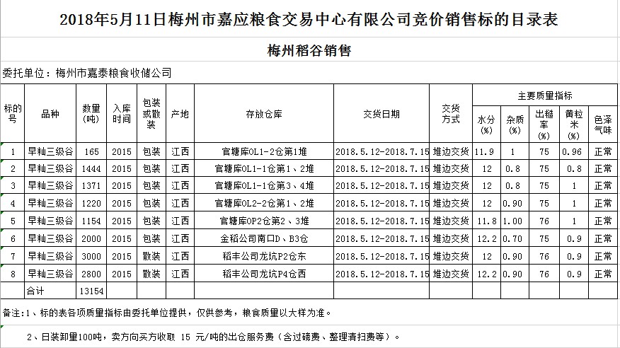 受客戶委托,梅州市嘉應糧食交易中心有限公司定于2018年5月11日(星期五)舉辦糧食競價交易會,梅州市嘉泰糧食收儲公司擬銷售早秈稻13154噸。