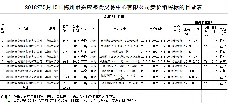 受客戶委托,梅州市嘉應(yīng)糧食交易中心有限公司定于2018年5月15日(星期二)舉辦糧食競(jìng)價(jià)交易會(huì),梅州市金良糧食收儲(chǔ)有限公司擬銷售早秈稻13874噸。