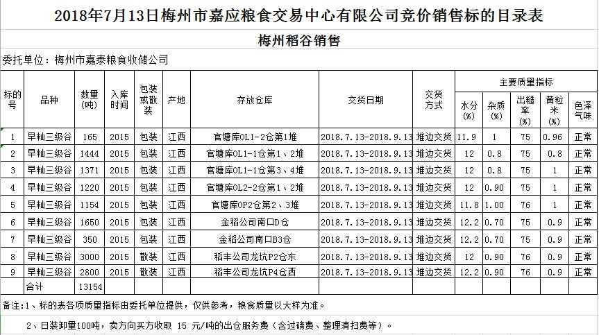 受客戶委托,梅州市嘉應糧食交易中心有限公司定于2018年7月13日(星期五)舉辦糧食競價交易會,梅州市嘉泰糧食收儲公司擬銷售早秈稻13154噸。