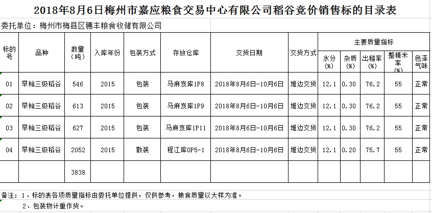 受客戶(hù)委托,梅州市嘉應(yīng)糧食交易中心有限公司定于2018年8月6日(星期一)舉辦糧食競(jìng)價(jià)交易會(huì),梅州市梅縣區(qū)穗豐糧食收儲(chǔ)有限公司擬銷(xiāo)售早秈稻3838噸。